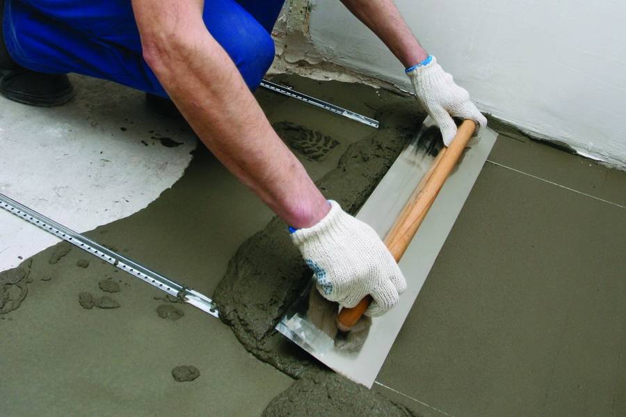 Первый шаг — заливка стяжки пола в соответствии со всеми требованиями однородности и прочности. Следующий шаг — установка маячков для оштукатуривания стены. Стены штукатурятся черновым и чистовым слоями, выравнивание — по мере необходимости. Внизу по всей длине стены нужно отметить участки, которые не будут обрабатываться. Это и есть место для скрытой системы, которая будет монтироваться прямо к бетонной стене. Высота равна высоте самого профиля +10 мм.