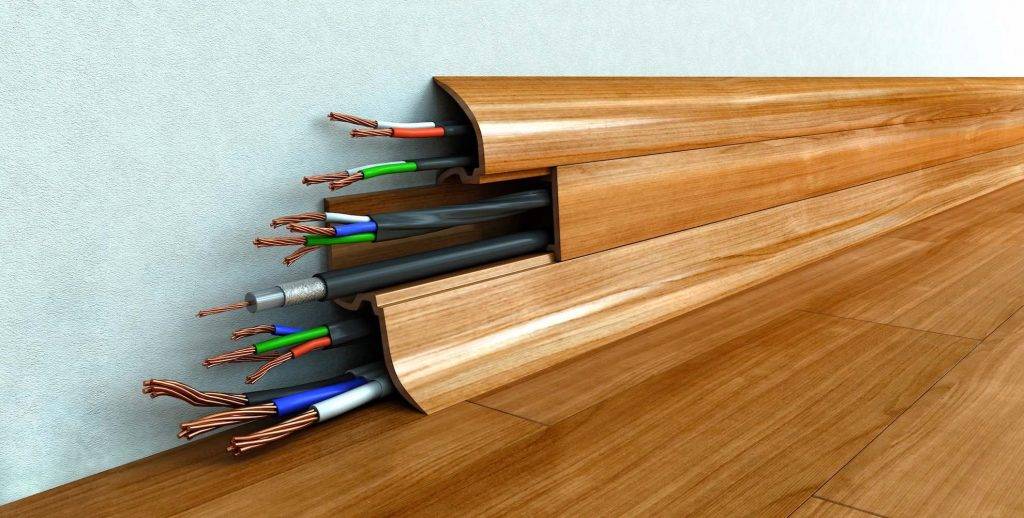 Здесь всегда стоит заранее определить общую толщину разводки, которую следует спрятать, чтобы не ошибиться с выбором параметров изделия. К полу и стенам плинтуса ПВХ крепятся на жидкие гвозди.