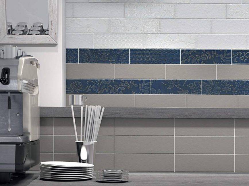 - Декоративные элементы часто используют при облицовке фартуков. Это могут быть вставки с плоским или рельефным рисунком. Их размеры должны полностью совпадать с общей плиткой и по высоте, и по ширине и по толщине.