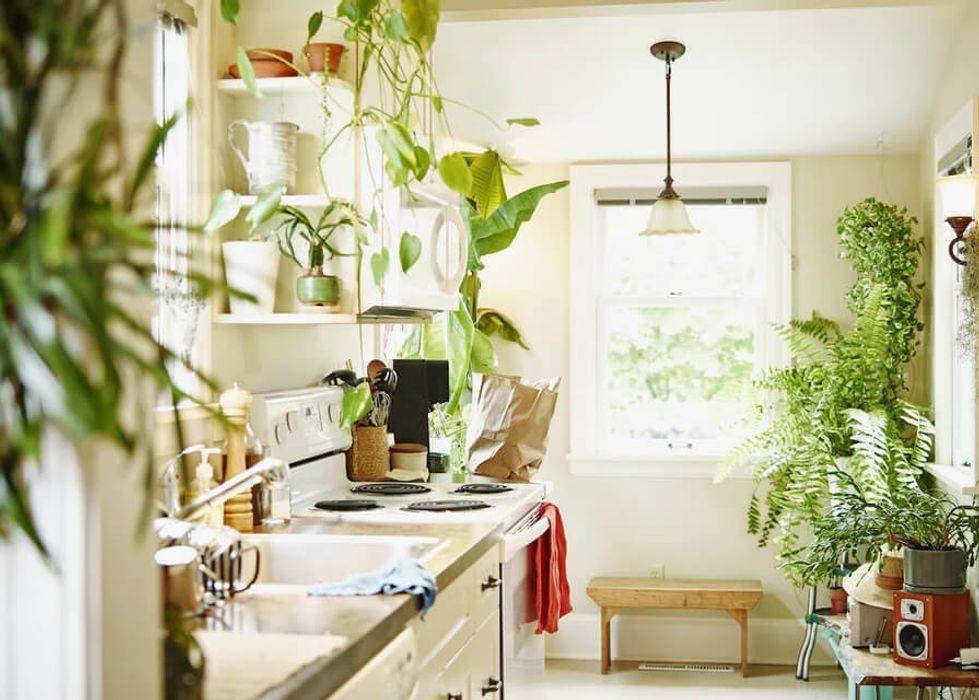 Комнатными растениями можно украсить даже небольшую кухню. Обычно горшки размещают на подоконниках, расставляя их рядами. Увеличить количество цветов можно с помощью специальной подставки с ярусами: ее устанавливают на подоконник, цветы размещают на полочках или в металлических держателях.