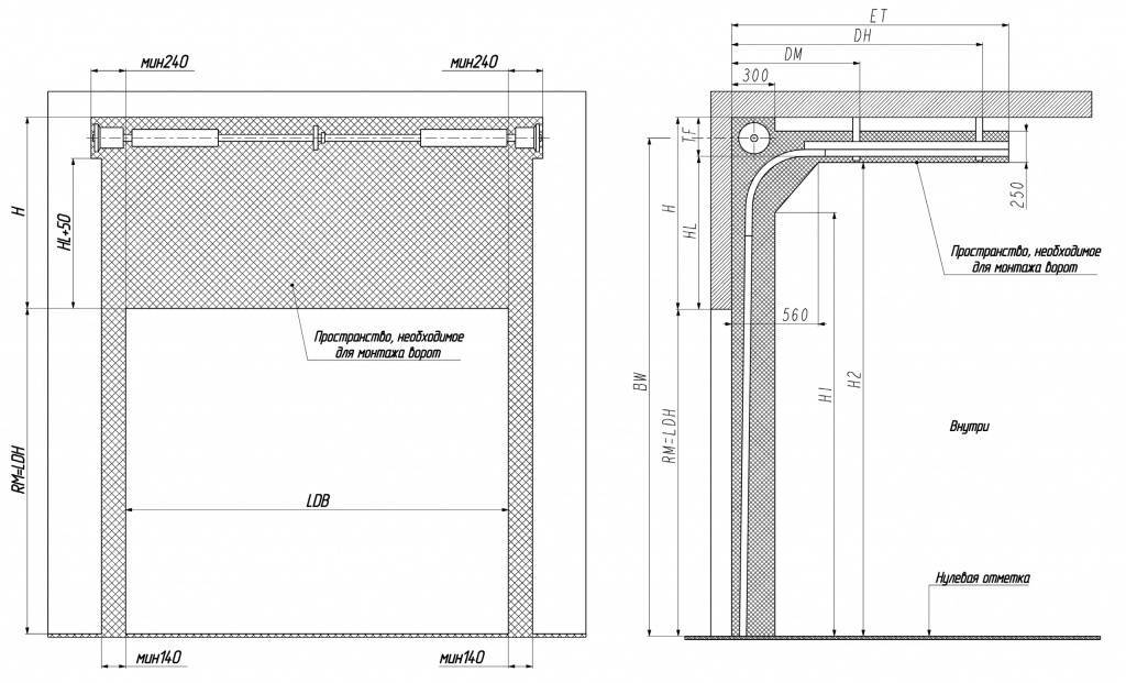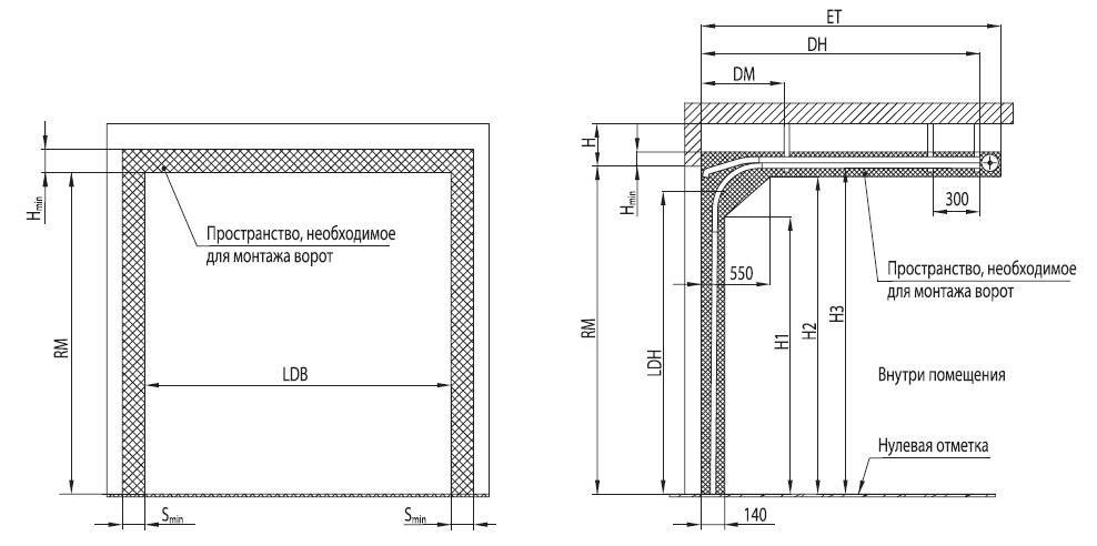 Основными габаритами гаража, которые необходимо учесть для установки секционных ворот, являются:
