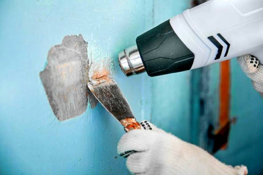 Другой способ избавления от краски – использование строительного фена. Метод эффективный, но небезвредный и затратный, так как сам фен стоит дорого. Работа требует времени и терпения, а испарения, возникающие в процессе плавления старой краски, очень вредные. Сама процедура предполагает нагревание окрашенного участка горячим воздухом до размягчения старой краски, которую со стены снимают шпателем.