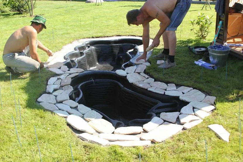 Декорируют водоем любым выбранным способом. Зная, как выкопать яму для искусственного водоема, ее прикрывают любым подручным материалом – старые баннеры в качестве подложки подходят идеально.