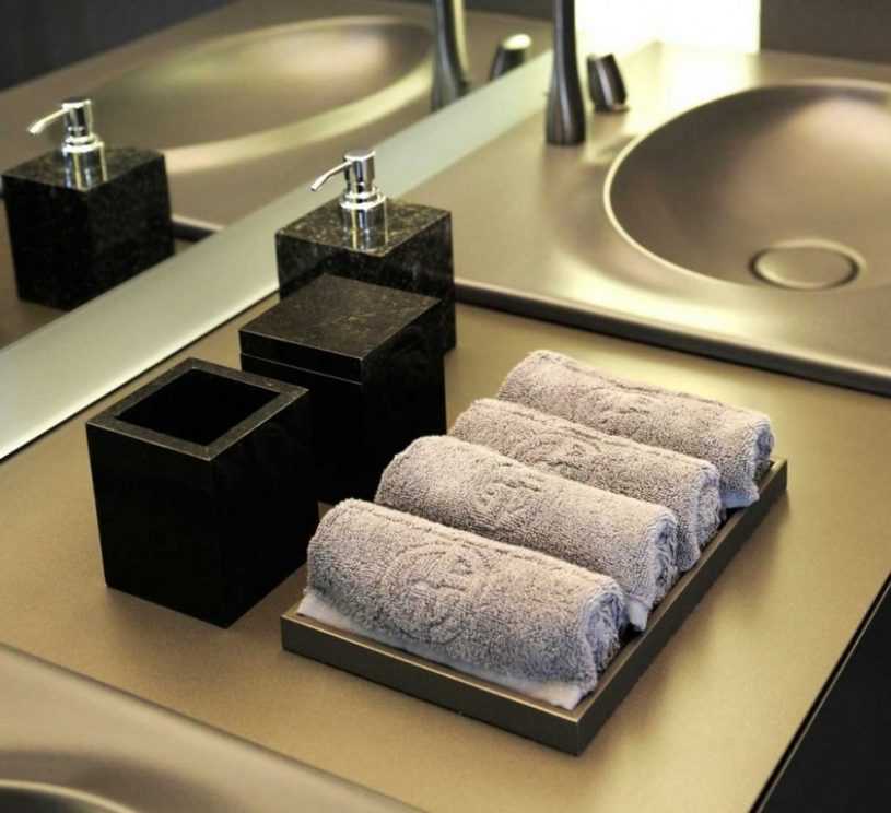 Подставки рекомендуется покупать сразу в наборе с мыльницей, дозатором, стаканом для зубных щёткой и другими предметами для ежедневного ухода. Так однозначно всё будет выполнено в одном общем стиле и не придётся подбирать каждую вещицу по отдельности. Смотреться будет такое оформление выгодно и богато.