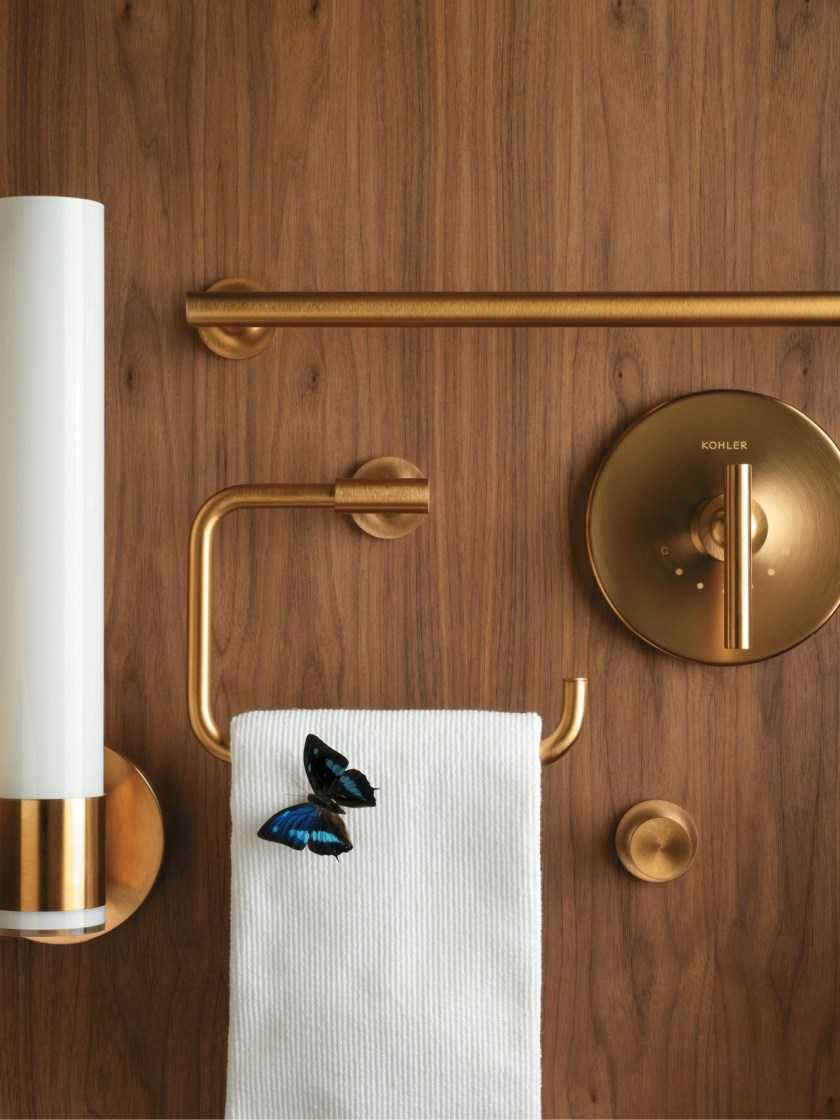 Стильные аксессуары медного цвета в сочетании с черной сантехникой
