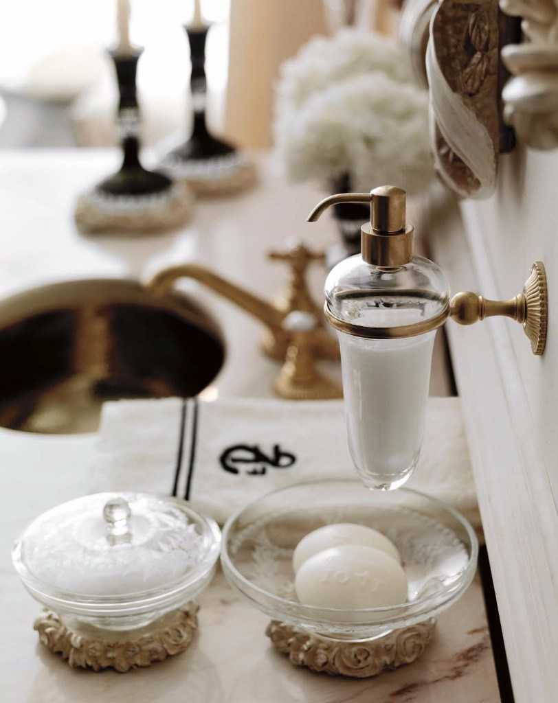 Роскошное оформление отделки стен ванной, сантехники и аксессуаров в одном стиле и цветовом решении