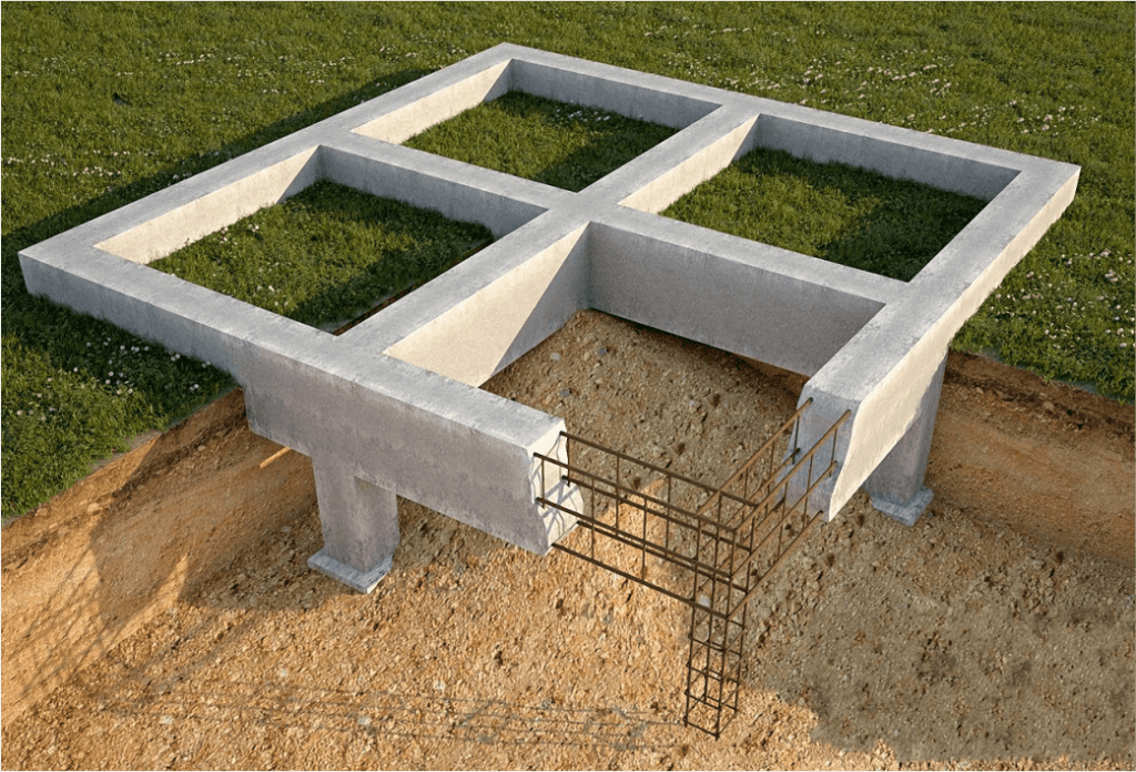 Как правило, он состоит из двух частей: наземной и подземной. Они могут быть одинаковы по всем параметрам: ширина, высота, глубина 50 сантиметров. Под описываемый проект данный тип фундамента будет стоить с учетом материалов и работы приблизительно 250 000 рублей. Можно ли сделать дешевле? Да, без проблем. Причем сразу в два раза. Для этого мы срежем вполовину высоту и глубину. То есть у нас получится мелкозаглубленный (на 25 сантиметров) и невысокий над грунтом (также 25 сантиметров) фундамент. Для одноэтажного дома это неплохой вариант, даже, можно сказать, наиболее целесообразный.
