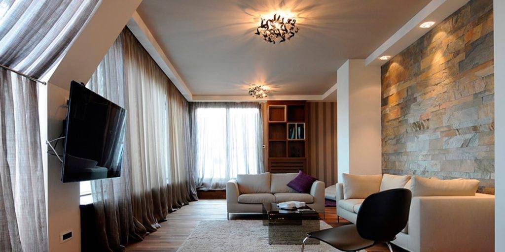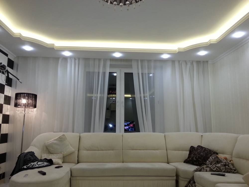 Двухуровневые натяжные потолки в гостиной являются довольно практичным решением — позволяют проработать несколько вариантов освещения и зачастую решить технические вопросы, связанные с неправильной геометрией помещения.