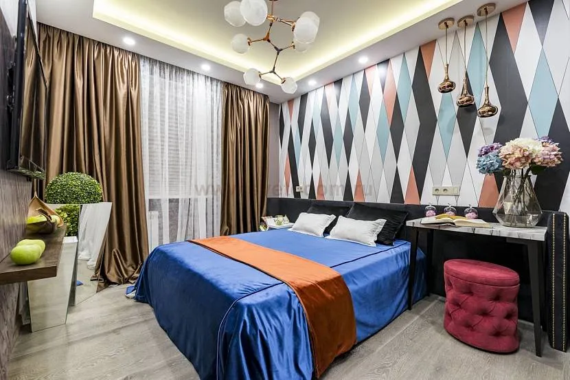 Узкие длинные комнаты хочется поделить поперечной полосой на более равновесные зоны. Это можно сделать при помощи акцентной полосы, которая начинается у изголовья кровати и плавно перетекает на потолок. Она может проходить через все перекрытие или же покрывать его часть.