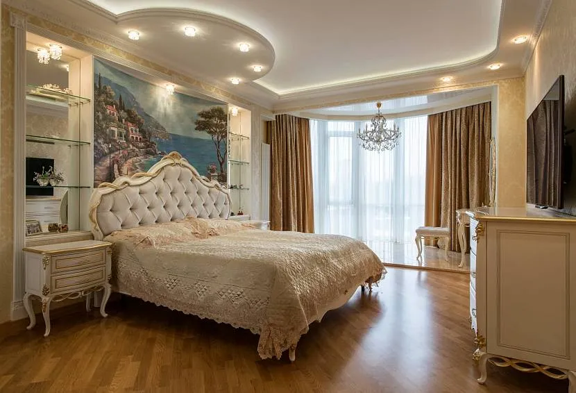 Спальня считается интимной частью квартиры, поэтому важно правильно выбрать освещение этой комнаты. Простор фантазии в этом плане предоставляют многоуровневые фигурные потолки