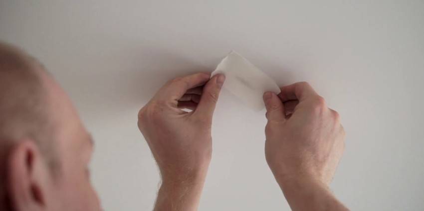 Как заклеить дырку в натяжном потолке своими руками? Здесь способен помочь строительный скотч. Им можно зафиксировать порез, равный 1-2 см. Делать это нужно аккуратно, стянув края полотна в месте разрыва. Можно использовать пластиковые стаканчики: вырезать из них полоски-фиксаторы шириной около 1 см, нанести суперклей и заклеить дефект.