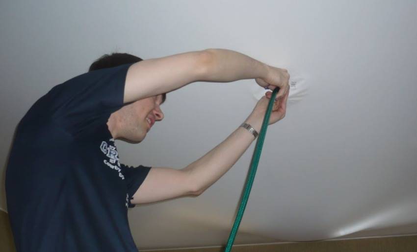 После натяжения полотнища навесные элементы фиксируются на своих закладных площадках, а установки точечных светильников места прокола оснащают пластиковыми шайбами.