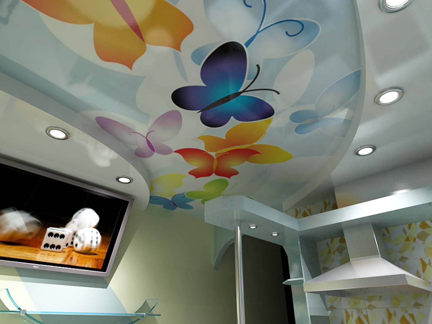 Нередки и комбинированные варианты – совместное использование гипсокартонной конструкции с натяжными полотнами. Чаще всего выступающая часть, скрывающая проводку и трубы, делается из гкл, а центральная зона отводится под натяжные потолки. Судя по следующим фото потолочных поверхностей на кухне из гипсокартона хозяева очень часто не ограничиваются таким разделением и используют дополнительную декоративную обработку потолочной поверхности – при помощи той же фотопечати.