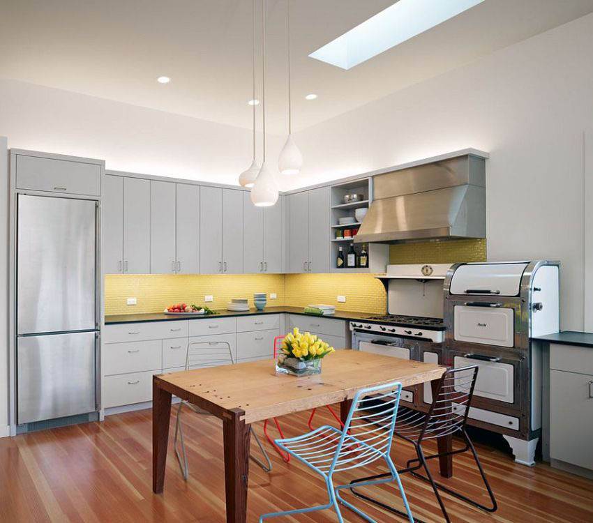 С помощью осветительных приборов можно выделить отдельно обеденную и рабочую зону, а также общее пространство. Каждая из зон и вся кухня в целом должны быть хорошо освещены. Свет может быть холодный или теплый, но главное, чтобы он не менял цвет продуктов и не добавлял им странный зеленоватый или синеватый оттенок. В классических, деревенских, морских интерьерах используются лампы с теплым, близким к солнечному светом. Для помещений в стиле минимализм или техно больше подходят источники холодного света.