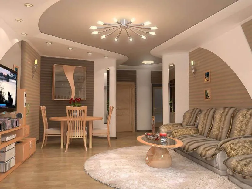 Красиво, аккуратно и со вкусом. В это трудно поверить, но безукоризненный дизайн потолка в зале, представленный конструкцией из гипсокартона, не только возможен, но и несложно реализуется своими руками без дорогостоящих услуг профессионалов.
