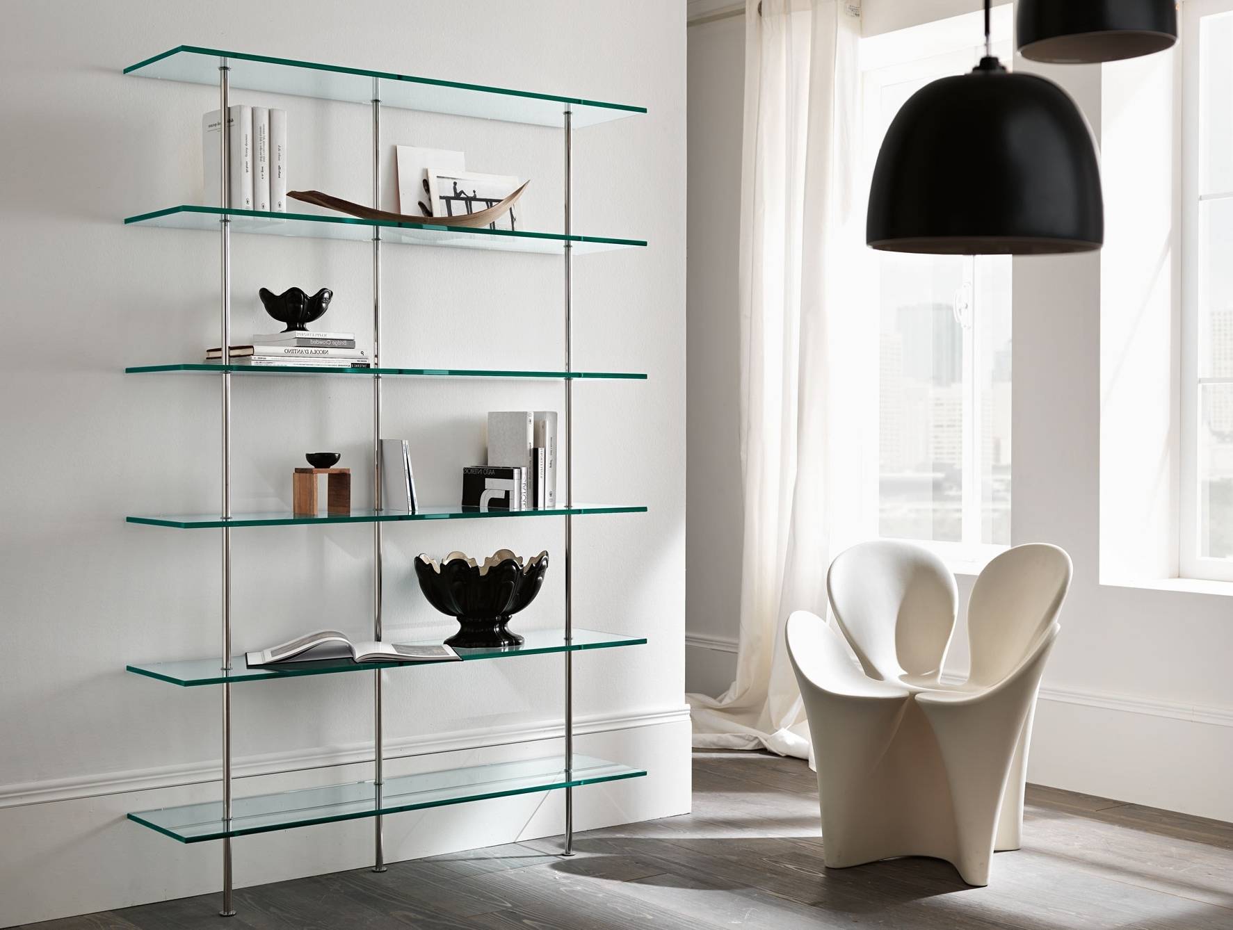 На смену пришли стильные стеллажи из стекла и металла. Прозрачное стекло или ажурная ковка визуально воспринимаются легче, чем громоздкие полки из гипсокартона, привнося в интерьер стиль и нотки индивидуальности.