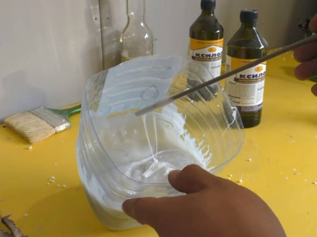 Как и в предыдущем случае, пенопласт загружается в лак-ацетоновую смесь небольшими порциями и тщательно вымешивается, чтобы избавиться от пузырьков и добиться полного растворения пенополистирола.