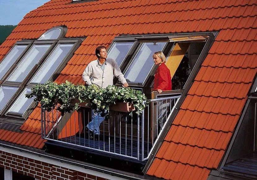 Такой гибрид – самое беспроблемное решение, но настоящим балконом его вряд ли назовёшь. Эта конструкция получается из трансформации мансардного окна и имеет две створки: нижнюю с верхней. Чтобы получить балкон, достаточно выдвинуть вперёд нижнюю. Она обратится в ограду с перилами. Створка верхняя, приподнятая до горизонтального положения, превращается в козырёк балкона. Разложенный балкон в мансардной крыше оснащён боковыми поручнями. При возвращении его в исходное положение они складываются и прячутся внутрь.