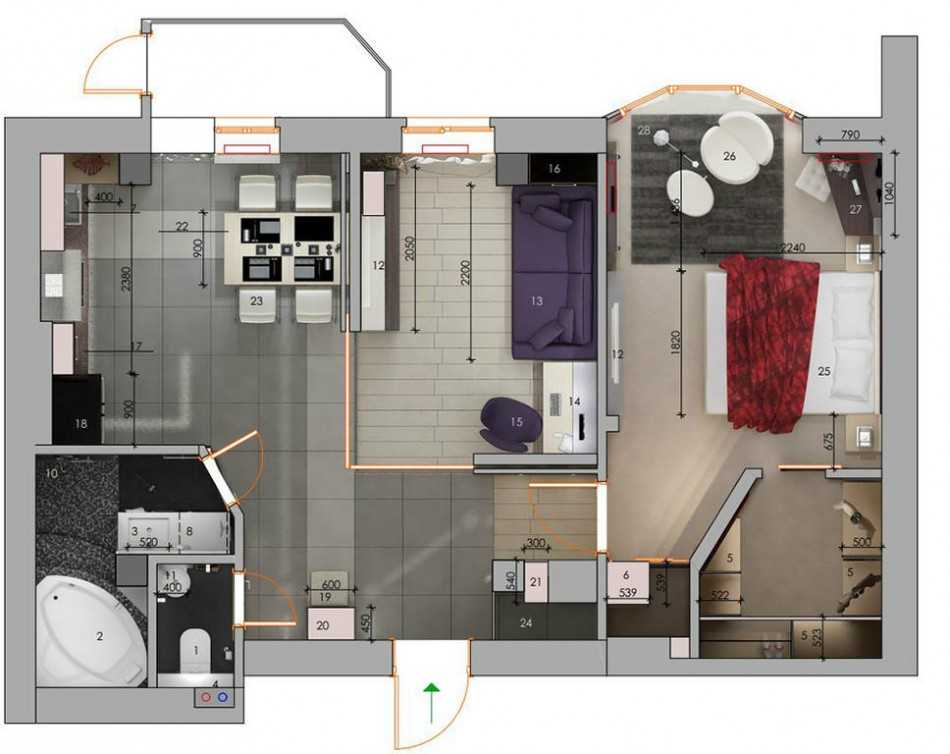 Важно понимать, что каждый тип внутреннего помещения имеет уже заложенные размеры. Устанавливая стену или перегородку, проектируется новое помещение