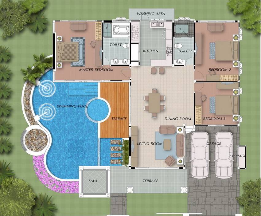 Планировка загородного дома с гаражом и прилегающим бассейном