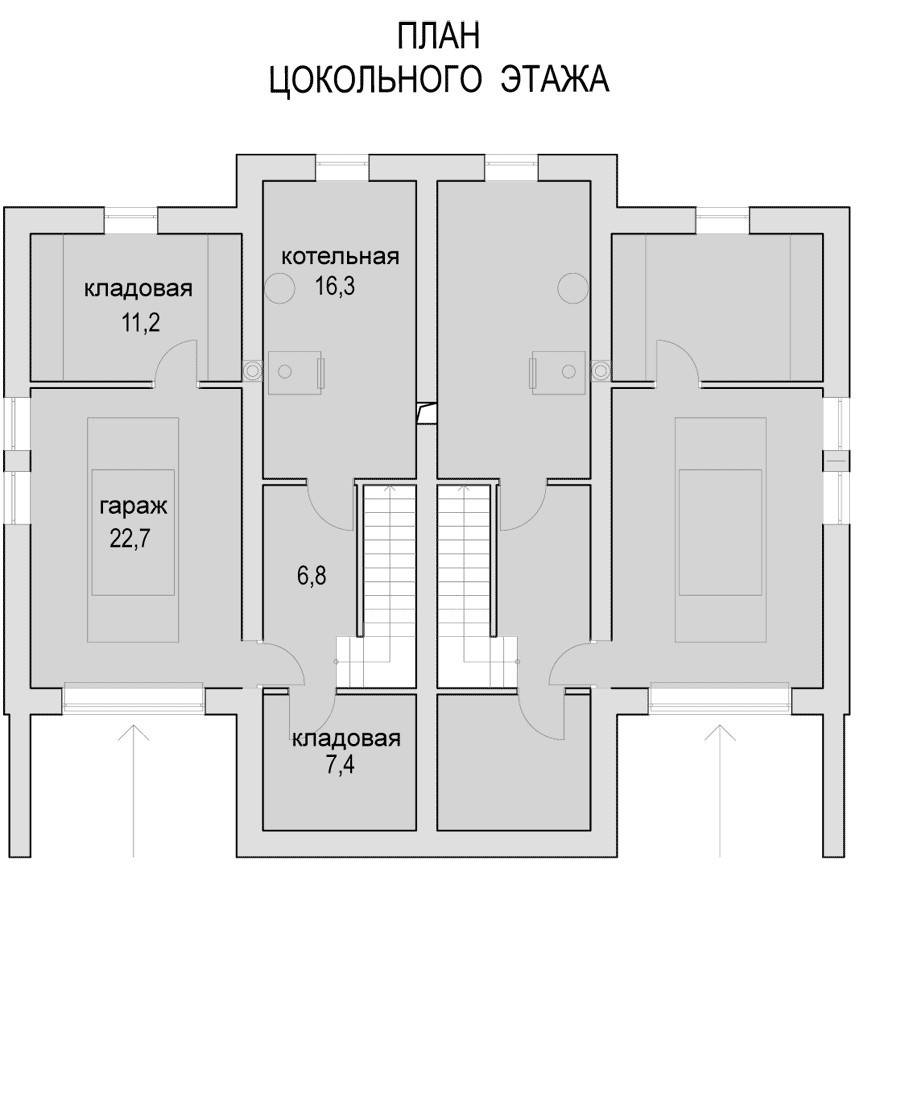 Кроме первого и второго этажа здесь предусмотрен цокольный этаж с гаражом, мастерской, кладовой и котельной.