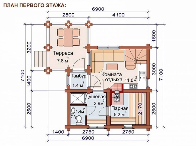 Как расположить комнаты, зависит от вида бани. Моечная и парная в русской бане могут находиться в одном отсеке. А вот в финском варианте мойка и парилка должны быть отдельно друг от друга. Парная, как самая важная комната, занимает 8 м2. На такой площади комфортно помещается печь и 2-3 лежака.