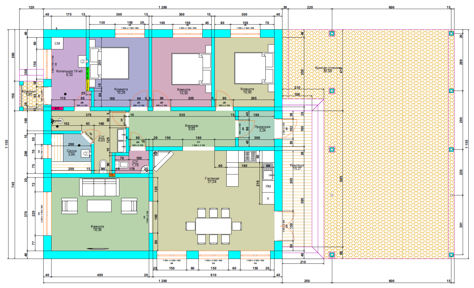 Стандартная планировка одноэтажного дома до 100 м2, включает в себя следующие помещения: