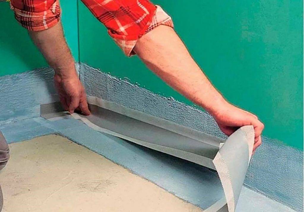 - Постелить гидроизоляционный материал так, чтобы он покрывал небольшую часть стены.
