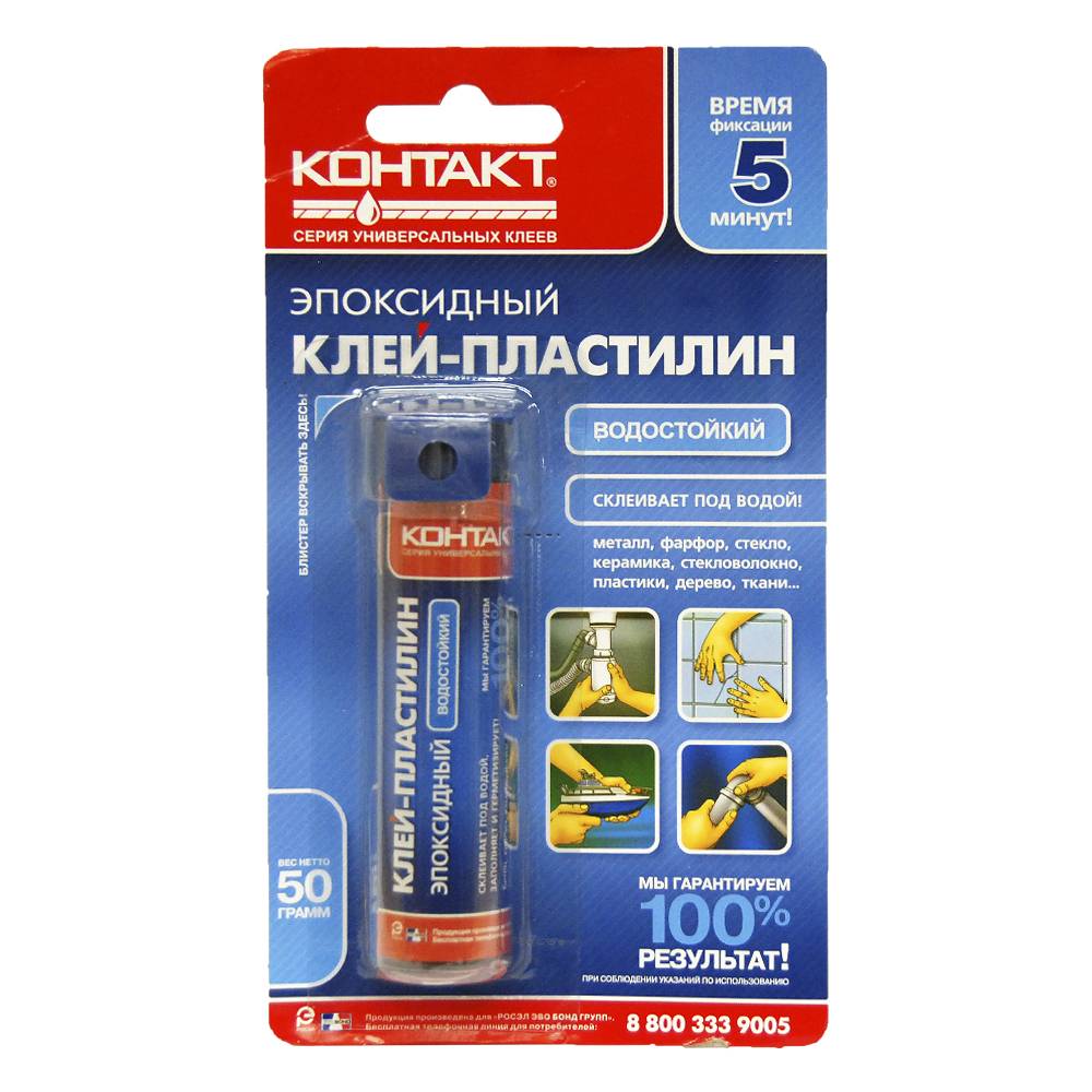 - Клей-пластилин «Контакт». Один из самых популярных, китайского производства. Предназначен для заделки течей в трубах, под водой. Однокомпонентный состав разминается пальцами в течении 2-3 минут, и пластилин готов к применению. Герметичность соединения достигается за 5-7 минут, можно работать с пластиком, металлом, стеклом и деревом, а также с камнем и кирпичем.