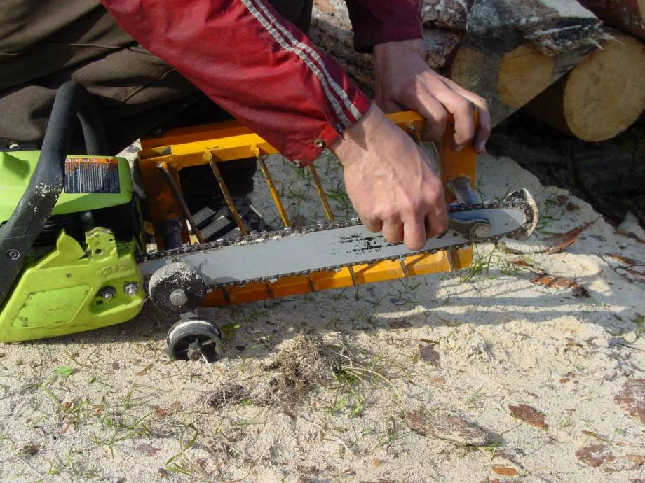 Данная конструкция обладает уже куда большей точностью (хотя и генерирует большое число отходов по сравнению с традиционными пилорамами). Но работать она может только с мелкими бревнами – их диаметр не должен превосходить протяженность шины. Ее устройство выглядит так: рама крепится к основанию пильной шины и на ее конце. Для регулировки ширины выпила точки крепления можно перемещать.
