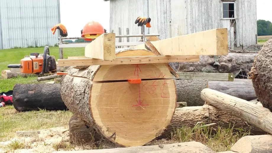 Раскрой бревен на доски бензопилой при помощи вертикальной насадки
