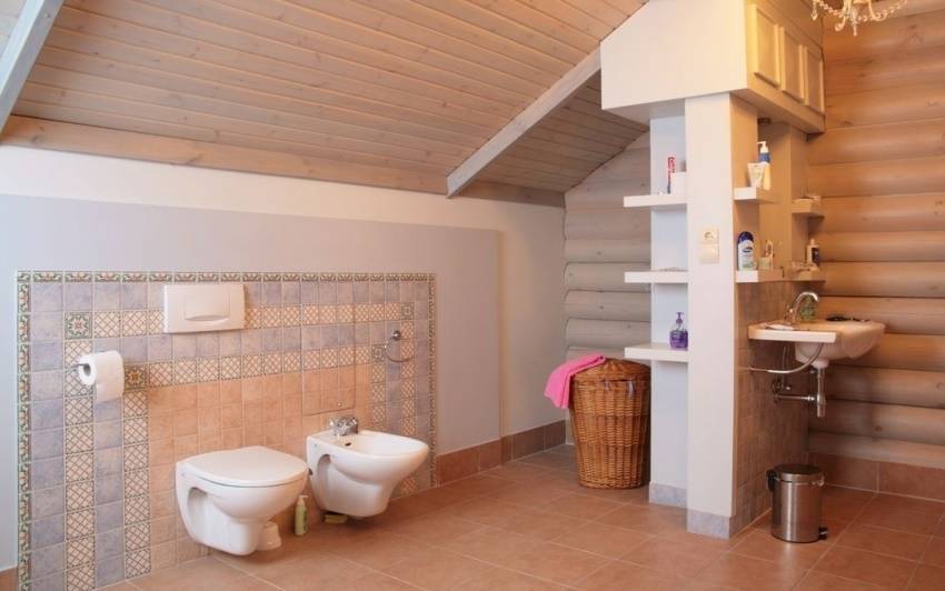 - На двух уровнях – когда в области ванны, душа, умывальника монтируется плитка, а остальная площадь оставляется без отделки. Такой вариант применяется для домов из оцилиндрованного бревна и бруса, изготовленного по клееной технологии.
