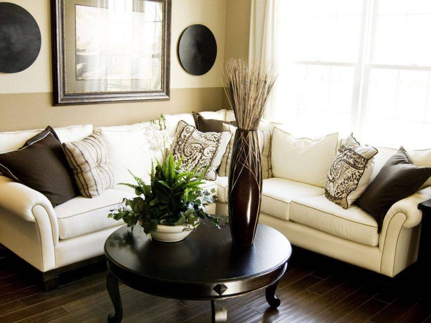 Выполнив отделку гостиной комнаты в тонах «беж» можно получить удачную гамму теплоты и уюта. Современность придают оригинальные сочетания черного цвета и белоснежной палитры.