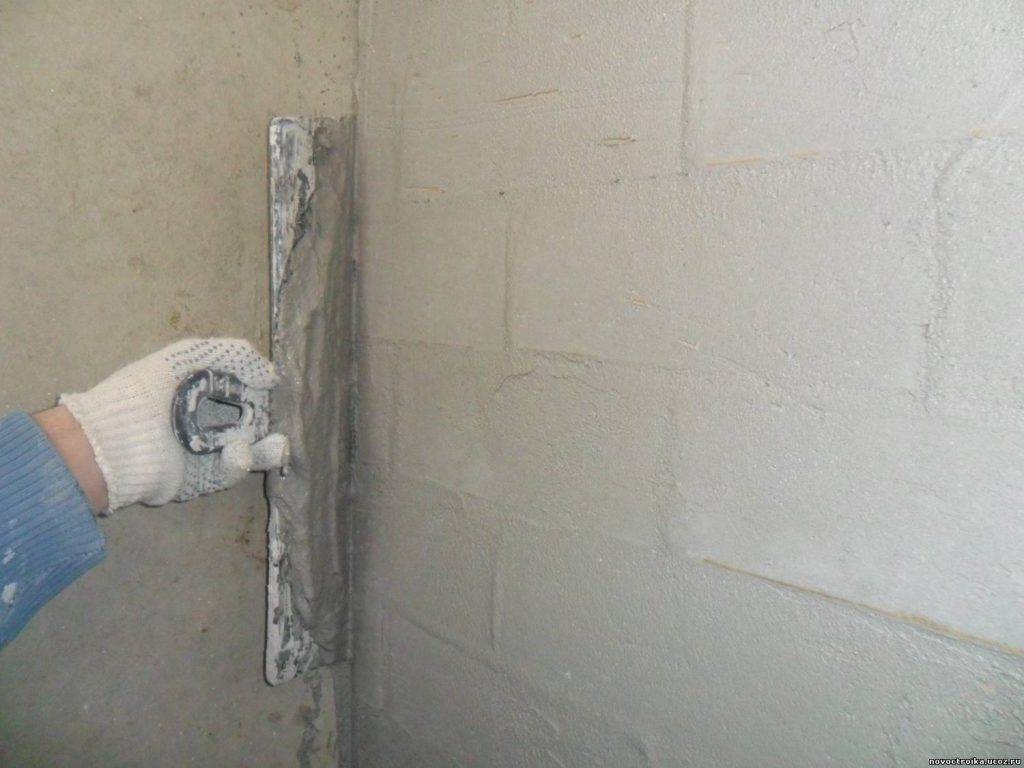 Примерно через 30 минут штукатурная смесь начнет схватываться, на данном этапе ее нужно будет выровнять. Рейкой из металла понадобится срезать излишки, после чего заполнить углубления. В углах они могут быть удалены при помощи специального рубанка.