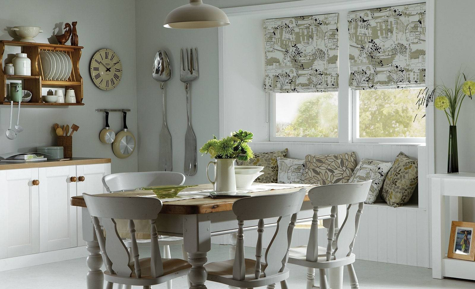 Для изготовления качественных рулонных штор для кухни применяют в основном натуральные материалы, среди которых: бамбук, лен, ситец, хлопок, смесь материалов. Принт штор выбирается исходя из общего интерьера кухни. Если потолок расположен низко, то стоит отдать предпочтение роллетам с вертикальными узорами. Если же комната для готовки и приема пищи узкая, то актуальней подобрать на шторах горизонтальные узоры.