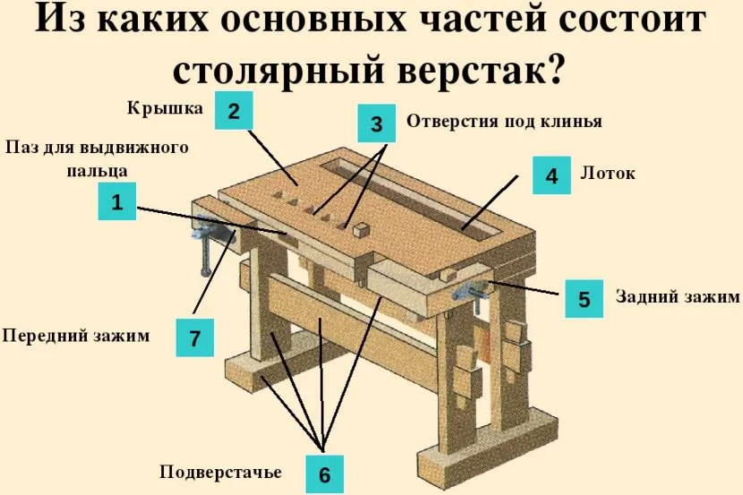 Перед изготовлением верстака для столярных работ знакомятся с его основными частями Источник infourok.ru