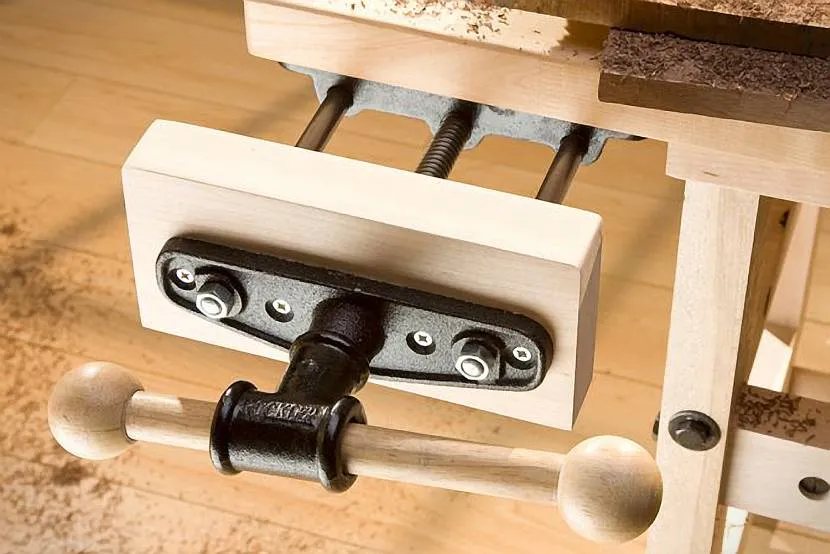 Зажим осуществляется за счёт губок. Одна из них фиксированная и крепится непосредственно к столешнице, вторая подвижная. Губки изготавливают из сосновых досок. Параметры: 20x18x500 мм. В них проделывают отверстие с диаметром, соответствующим размерам винтового стержня. Затем сверлом № 10 делают отверстия под крепёжные шпильки. Для удобства выполнения работ рекомендуется губки соединить между собой гвоздями, а в конец монтажа удалить их.