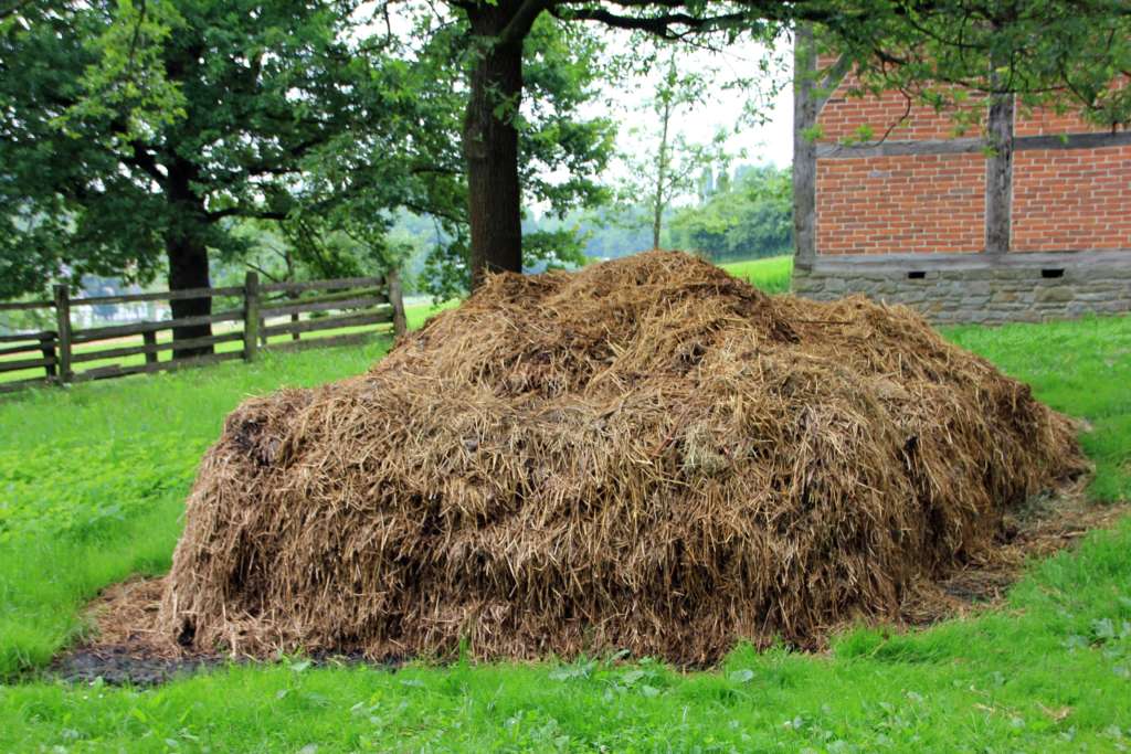 Стены котлована выполняют из камня на цементном растворе. Навоз укладывают штабелями высотой 1-2 м, после чего накрывают слоем торфа или мелкой соломы толщиной 10–15 см и периодически поливают жижей или водой.