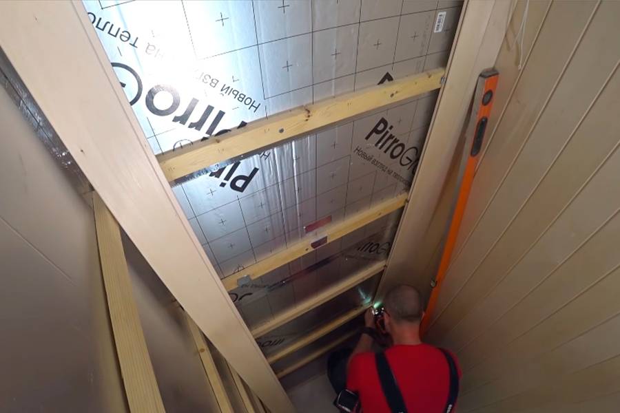 Для создания горизонтальной обрешетки к стойкам каркаса горизонтально крепятся бруски с сечением не более 3*4 см. Шаг крепления таких брусков не должен превышать 40 см. На этом же этапе можно поставить поперечный каркас, на который будут монтироваться лавки. Это позволит распределить нагрузку не на обшивку, а на обрешетку сауны. Перед обшивкой необходимо смонтировать приточный клапан вентиляции на потолке и, оставив клапан открытым, прикрепить к потолку фольгу. После этого производится обрешетка потолка и стен деревянной вагонкой, начиная со стороны двери на потолке и с угла на стене. Не рекомендуется загонять ламели в пазы до упора, так как при намокании древесина может немного набухнуть.