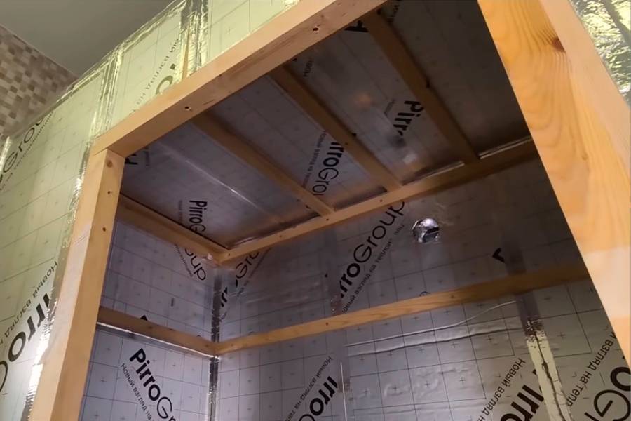 Перед тем как крепить к стенам брус самого каркаса, необходимо выполнить их пароизоляцию. На кирпичную кладку укладывается пергамин или битумированная бумага внахлест на 15-20 см. На уложенный пароизолят можно крепить деревянный брус, который крепится к стенам и полу. В каждом углу будущей сауны обязательно должна быть стойка каркаса. Чаще всего используют брус с сечением 5*5 см и устанавливают его с шагом чуть меньше ширины пароизолята. Далее монтируется каркас потолка с вентиляционным отверстием и отверстиями для электроснабжения. Дополнительно рекомендуется внутрь кабины провести несколько патрубков с установленными разбрызгивателями воды, они помогут предотвратить случайно возникший пожар. Внутри вентиляционного канала размещается противопожарный клапан, который не позволяет проникать горячему воздуху в другие комнаты дома.