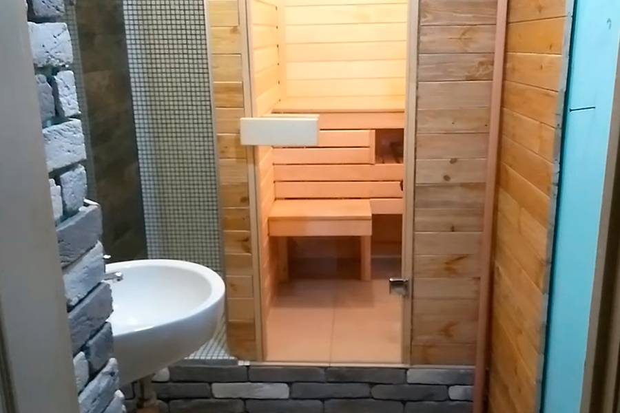 Здесь имеется вода (горячая и холодная), система вентиляции и канализация – все, что нужно для банных процедур. Вдобавок обустройство аккуратной сауны в ванной комнате не нуждается в перепланировании квартиры, поэтому согласование с РЭУ не потребуется.