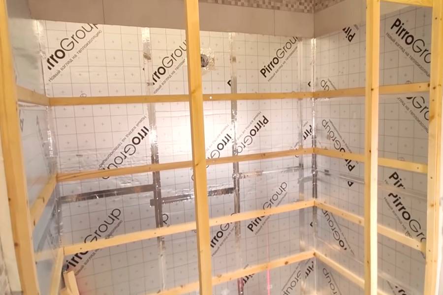 В качестве утеплителя может использоваться обычная минвата. Листы теплоизолирующего материала сначала укладываются между закрепленными брусками на стенах, а после и на потолке (при условии, чтобы была проведена вентиляция). Далее наступает очередь фольгированного материала и алюминиевого скотча. Эти компоненты призваны отражать и как можно дольше удерживать тепло в помещении.