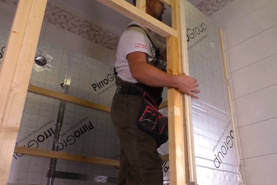 Прежде, чем делать обрешетку, необходимо установить пароизоляционный слой. Оптимальным материалом для этого служит пергамин, который крепят рейками с нахлестом. Далее наступает очередь самого каркаса, который изготавливается из древесных брусков (например, 5х5 см). В ходе монтажных работ понадобится определенный строительный инструмент. Бруски закрепляются повсеместно по периметру стен и потолка с достаточно дробным шагом (до полуметра).