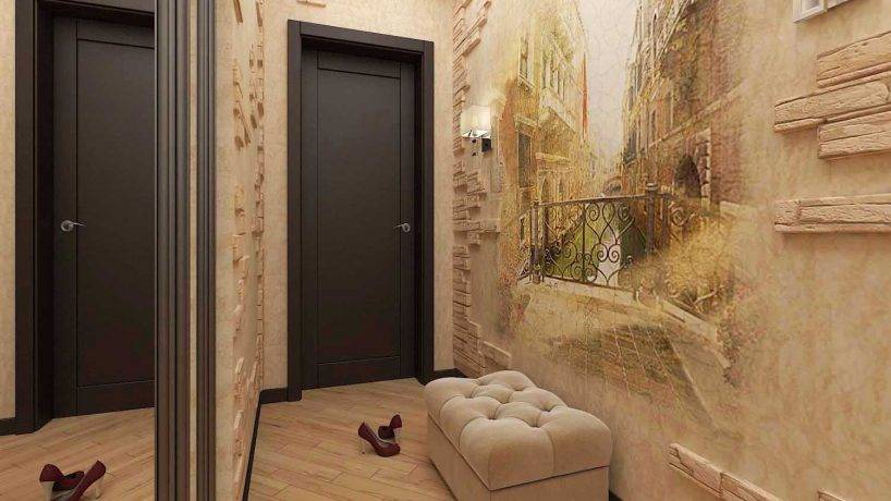 - Фотообои. Отличный вариант, который клеиться на длинную стену или же торец небольшой прихожей.