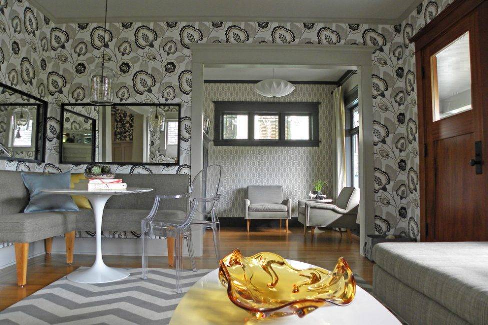 Монохромный серый интерьер. Из различных оттенков серого можно создать интересное дизайнерское оформление помещения, добавив к основному тону лишь белые и черные нотки. Бело-серые обои в интерьере на первый взгляд могут показаться слишком простыми и скучноватыми, но они создают атмосферу спокойствия и нейтральности, что очень актуально для людей, ведущих активный образ жизни и часто переживающих стрессы. Создать монохромный серый интерьер намного легче, чем работать с широкой цветовой палитрой. Если, к примеру, использовать лишь светлые оттенки гаммы, то риск сделать комнату мрачной и угрюмой будет практически нулевым. В подобном дизайне лучше всего будут выглядеть полупрозрачные текстуры, гладкие глянцевые поверхности. На фоне таких обоев превосходно будут смотреться яркие детали, к примеру, розового, желтого, голубого цветов. Если вы вообще не желаете прибегать к помощи ярких оттенков, но хотите чем-то разнообразить оформление комнаты, подбирайте обои с орнаментом. Рисунок может быть белым, черным или также серым, но другого оттенка.
