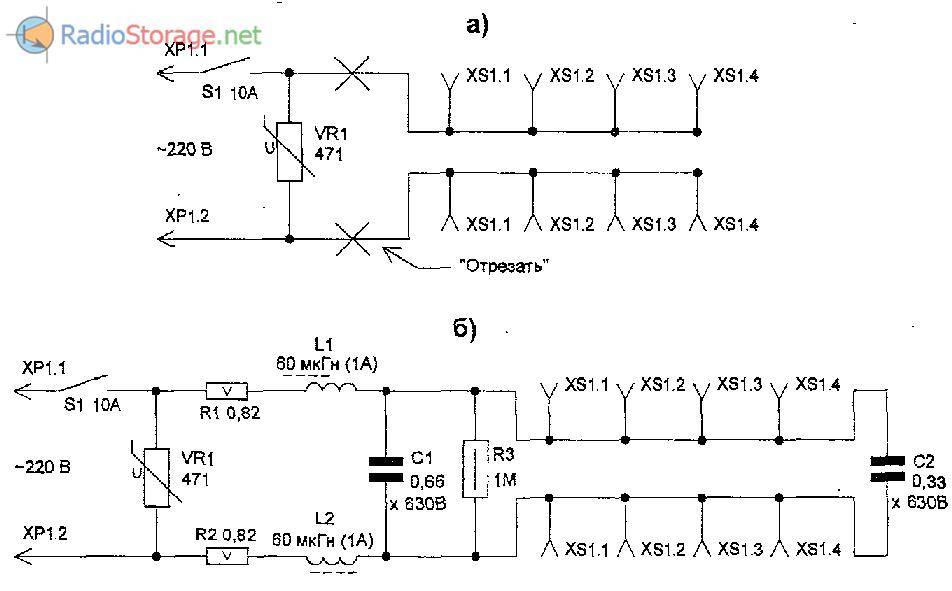 Обе схемы гасят входящие высокочастотные помехи индуктивными сопротивлениями дросселей и емкостными — конденсаторов. Ликвидация высоковольтных импульсов возложена на варистор.