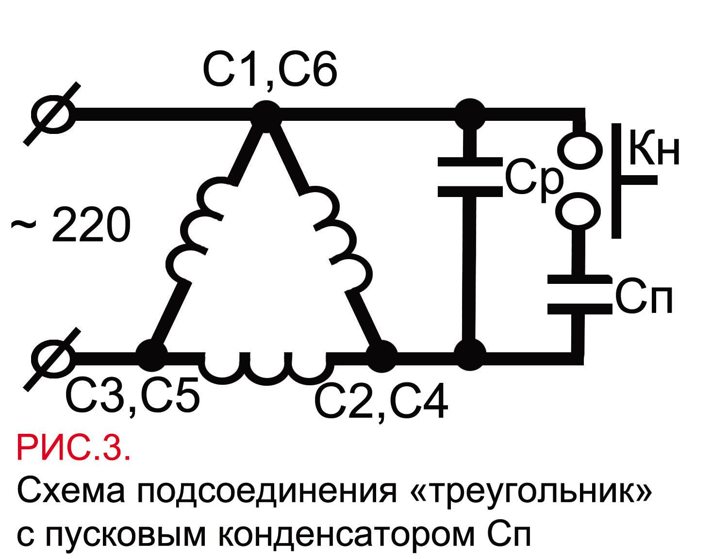 Емкость пускового конденсатора должна быть в 2,5 — 3 раза больше рабочего. Если двигатель легко запускается и мощности его достаточно для работы, то все подобрано правильно. Подключается все просто, на толстые провода подается в. подключение двигателя 380 на 220 вольт
