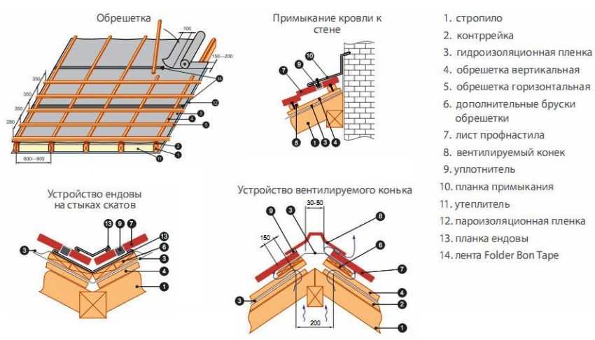 При монтаже материала на поверхности с дополнительными изломами понадобятся элементы, защищающие чердак постройки от воды. Отделку производят в соответствии с требованиями производителя, обеспечивая требуемую минимальную ширину планок. Владельцу здания необходимо подготовить прочную и аккуратную обрешетку, а для защиты чердака от влаги можно уложить слой пленки.