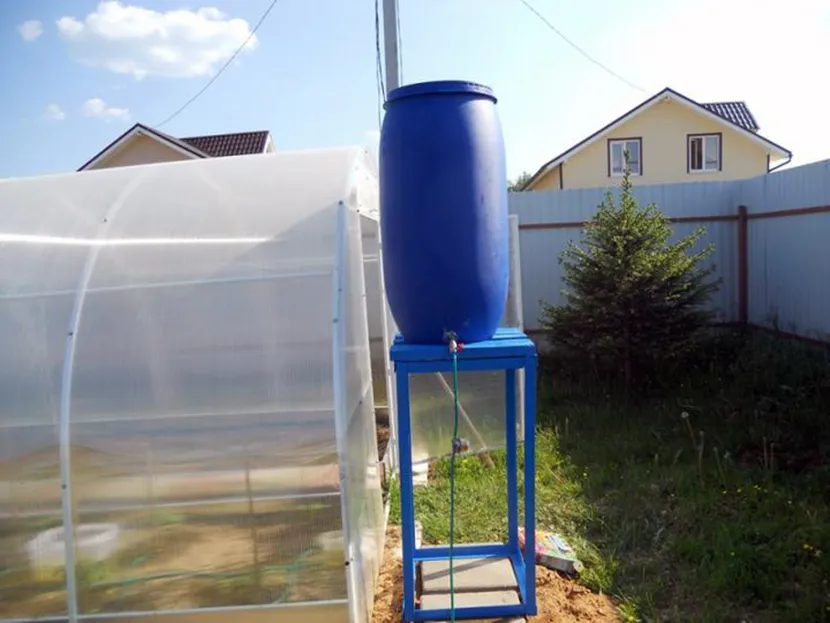 Вся изготовленная система подсоединяется к источнику воды. Полив дождеванием можно проводить непосредственно из водопровода. Для капельного орошения потребуется ёмкость, установленная на определённой возвышенности. Выбор высоты зависит от размеров и конструкции самого бака. Необходимо найти такой уровень, при котором его удобно заправлять. Для закачивания воды используются насосы.