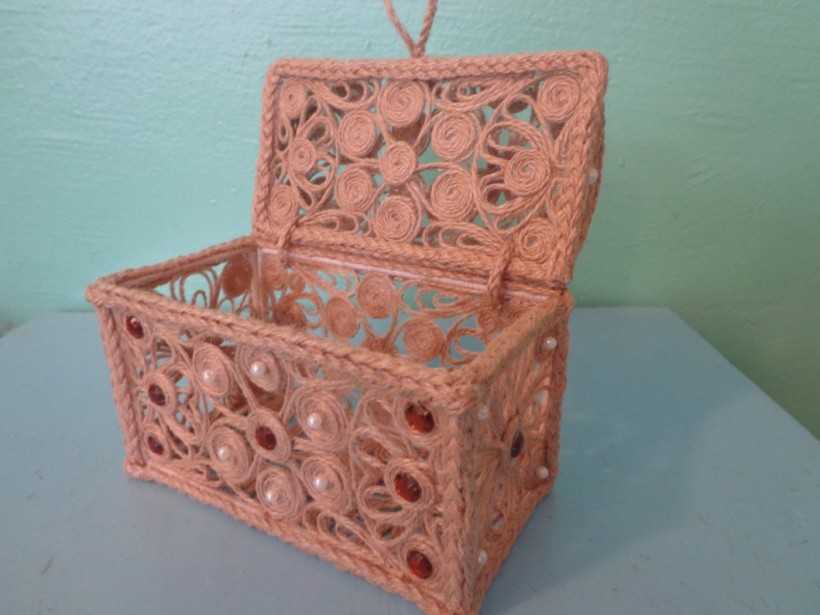 Вязание из джута крючком — одно удовольствие. У меня уже был такой опыт по созданию шкатулки и корзинки. Поскольку нитка толстая, то весь процесс происходит довольно быстро. Единственная неприятность – мусор, который сыпется со шпагата. Поэтому нужно вязать на голом полу, а не на ковре, или подстилать что-нибудь, чтобы легче потом убрать.